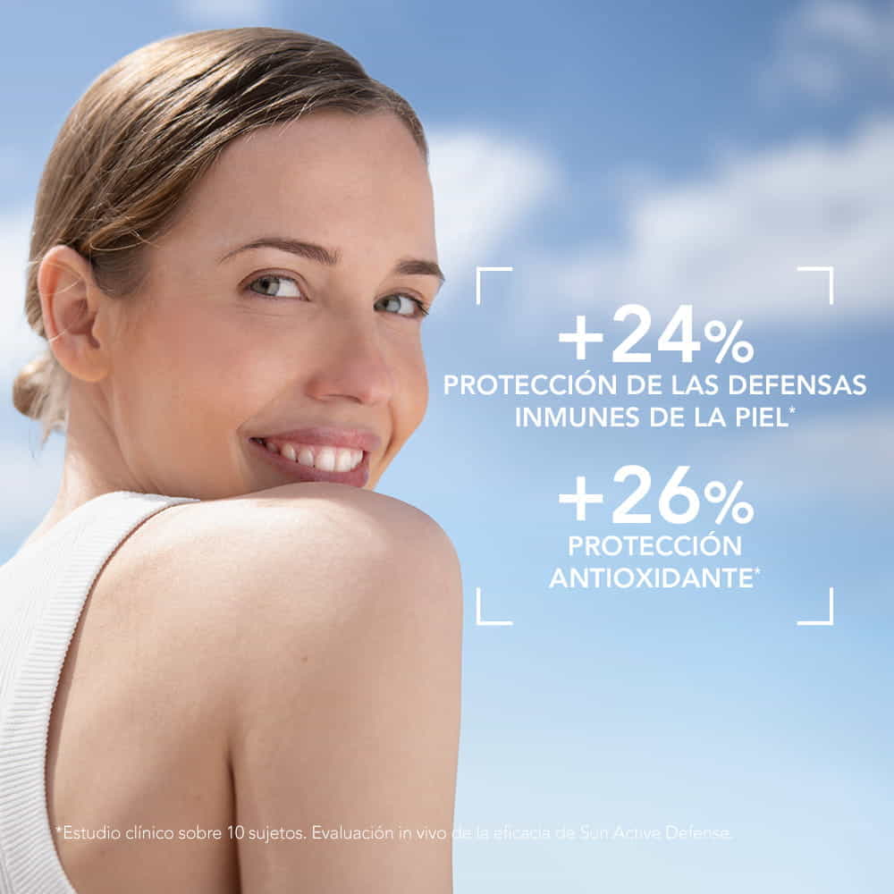 Este protector solar incorpora la tecnología SUN ACTIVE DEFENSE, que combina filtros solares con protección biológica para reforzar las defensas naturales de la piel frente a la radiación solar y el estrés oxidativo. Esto ayuda a prevenir el daño celular y el envejecimiento prematuro causado por la exposición al sol.